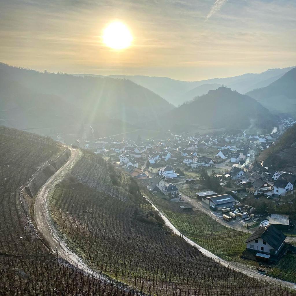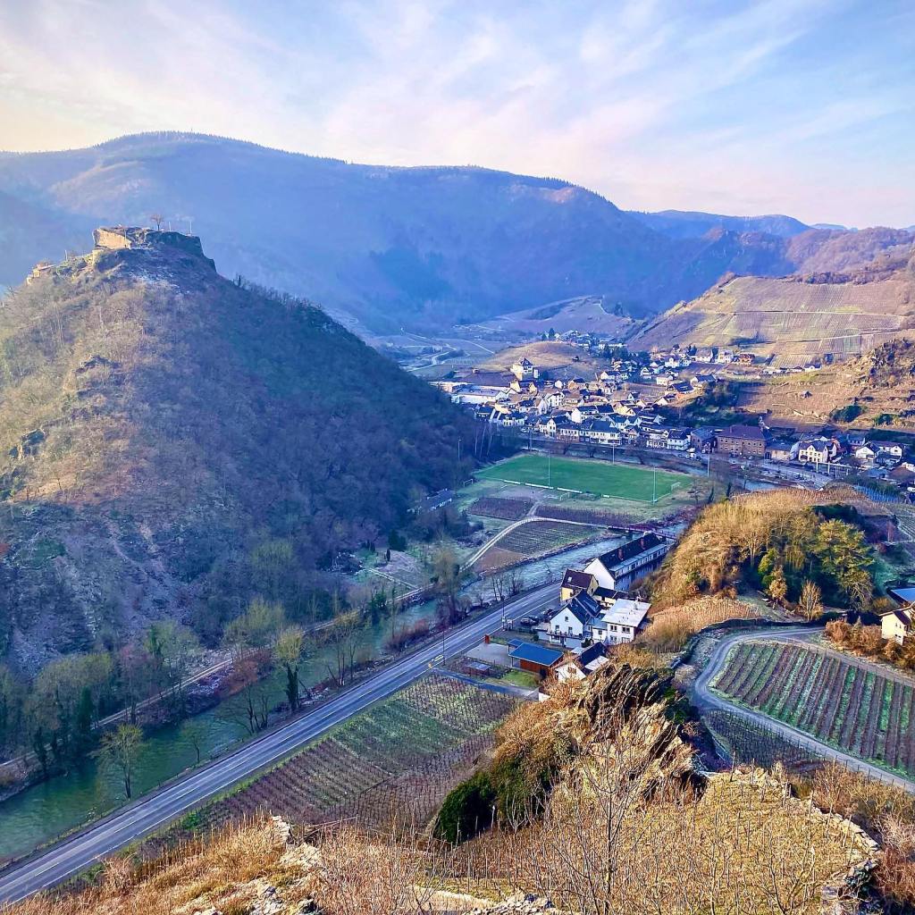 A pre-flood view of the Mayschoss from the vineyards above the village. The silhouette of the Saffenburg Castle ruins can be seen at the top of the mountain at the top right of the photo. In this photo, the Ahr River is hidden by hills at the right, but is located directly below Saffenburg Castle. At the left of the photo is one of many pathways used to access the vineyards in the hills above Mayschoss. These paths are collectively known as the ‘rotweinwanderstrasse’ or ‘red wine wandering path’.