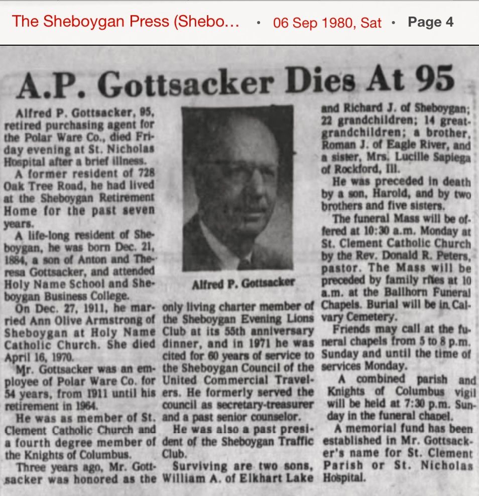 Alfred Peter Gottsacker obit from the Sheboygan Press on Sep. 6, 1980. The obit includes a picture.