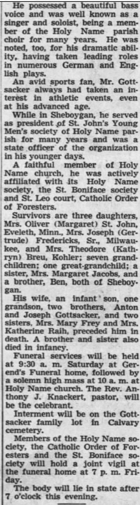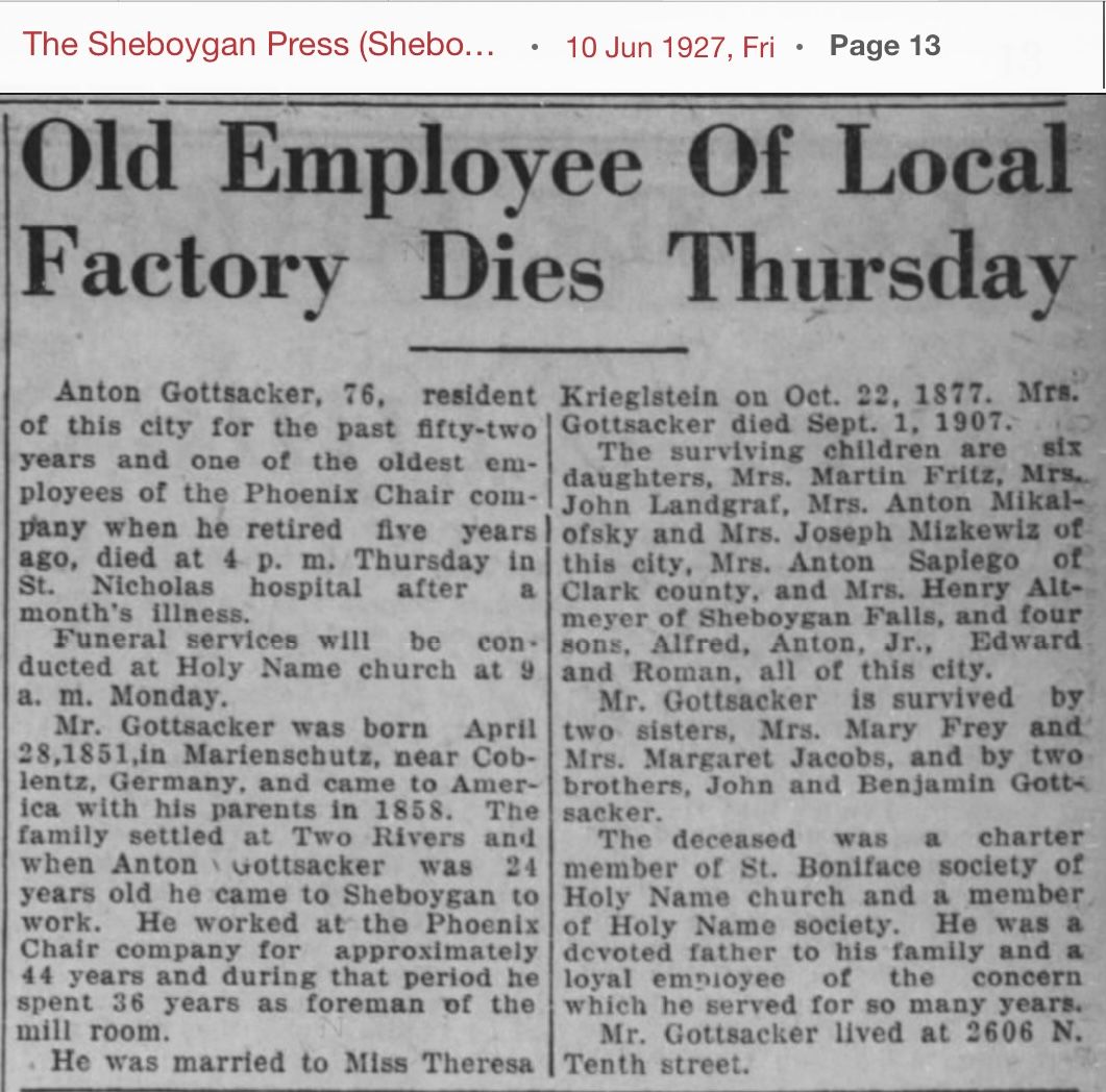 Photo of obit for Anton Huberticus Gottsacker from the Sheboygan Press dated June 10, 1927.