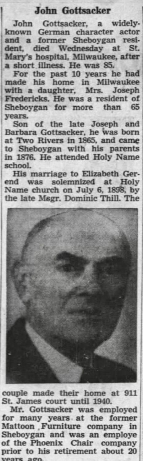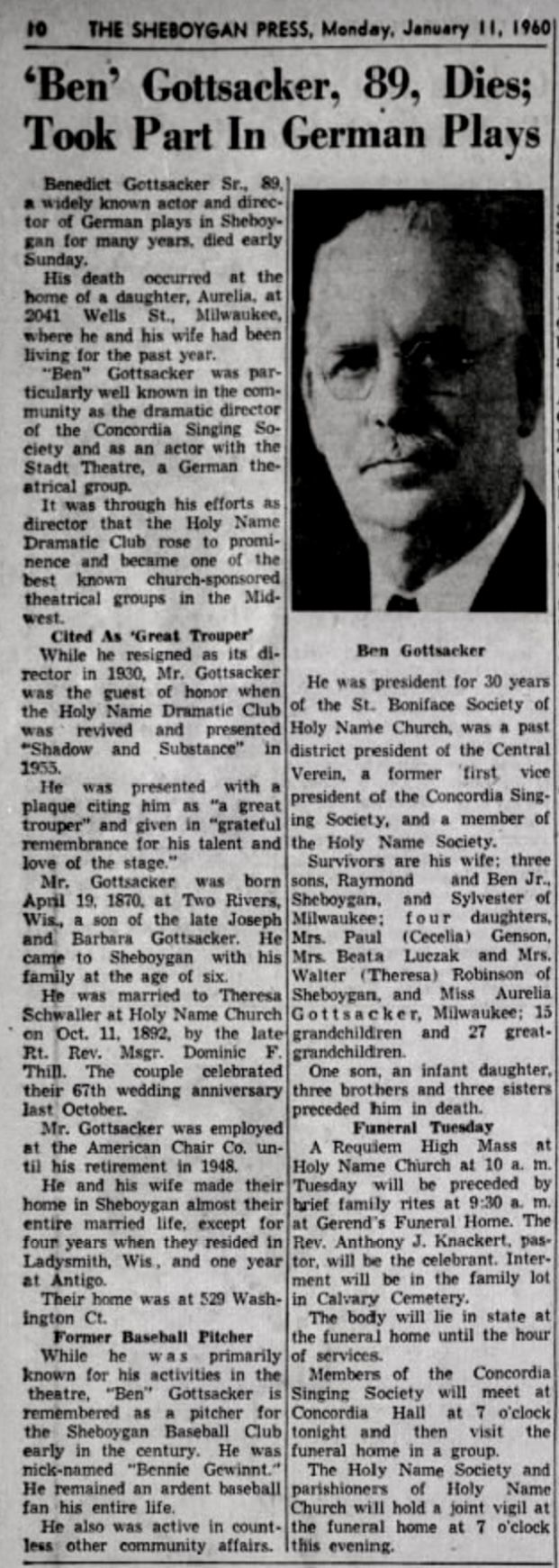 Photo of obit of Benedict (Ben) H. Gottsacker in the Sheboygan Press on Jan. 11, 1960. Ben was a foreman at the Phoenix Chair company and a well known actor/director in Sheboygan. Obit has a photo of Benedict.