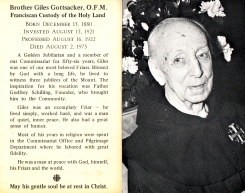 Prayer card back and front for Frank Gottsacker Jr., who became a Franciscan Friar after the premature death of his wife Rosa Scheible and son Leo. Brother Giles lived in the Franciscan Monastery in Washington, D.C.