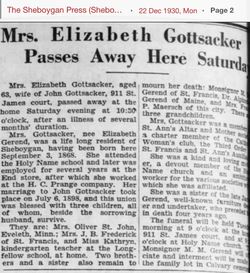Obit for Elizabeth Gottsacker Gerend from the Sheboygan Press dated Dec. 22, 1930.