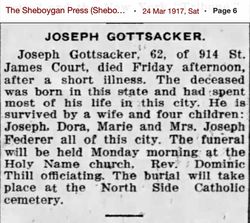 Photo of obit of Joseph Gottsacker, Obit is very short and is likely from the Sheboygan Press.