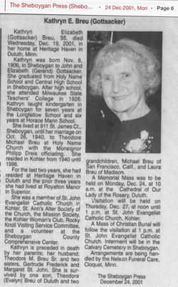 The obit for Kathryn Gottsacker Breu is from the Sheboygan Press and includes a photo.