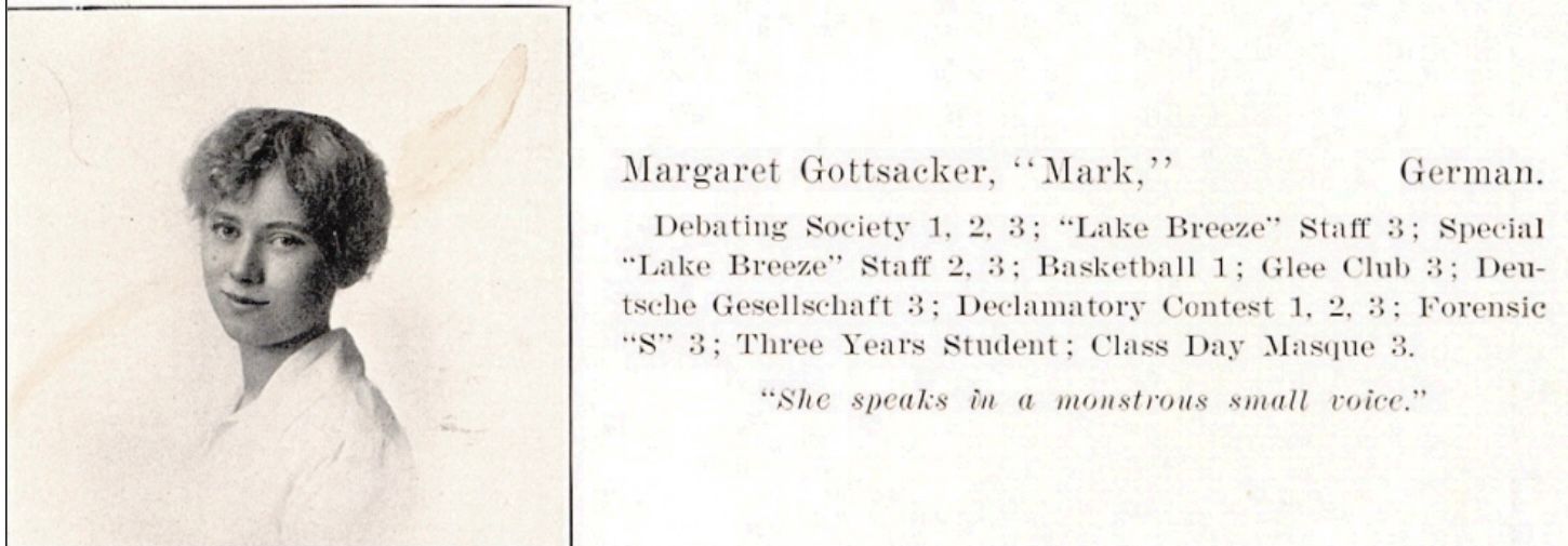 Below are pictures of three documents concerning Margaret Gottsacker St. Paul: A high school annual picture, an obit and a wedding announcement.