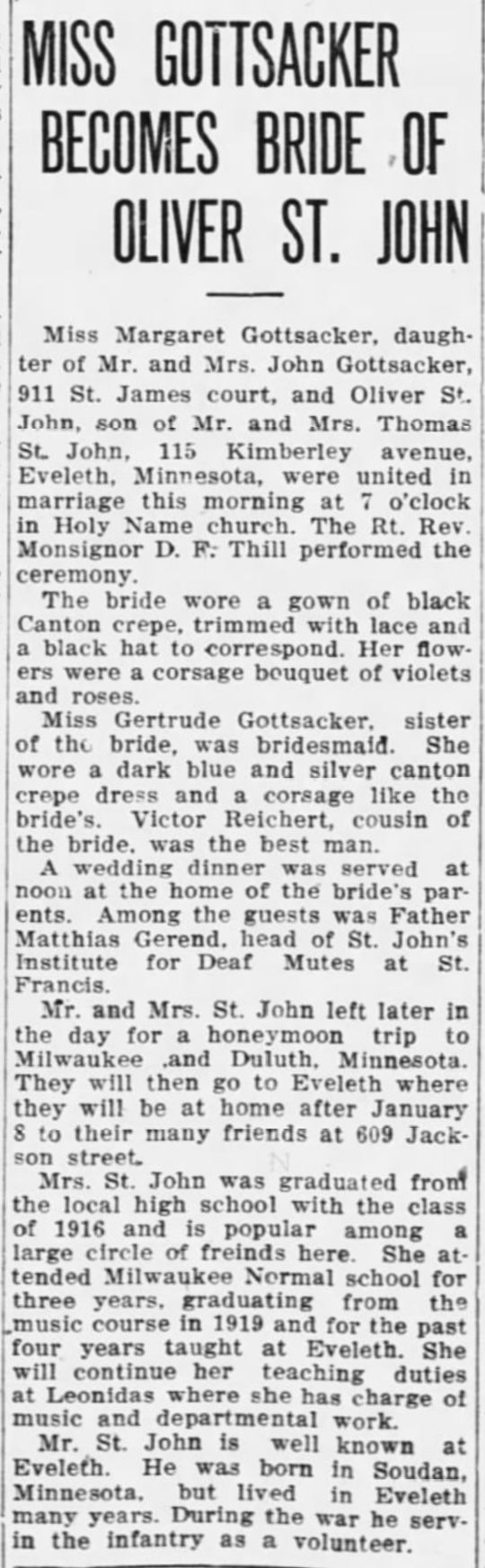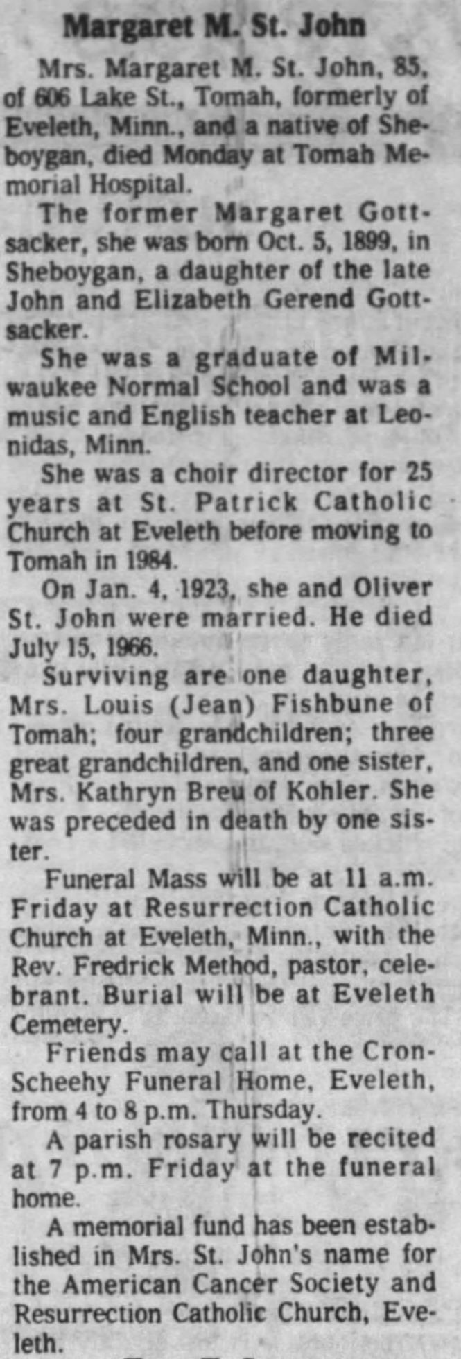 Margaret Gottsacker, daughter of John Anton Gottsacker & Elizabeth Gerend, wife of Oliver St. Paul.