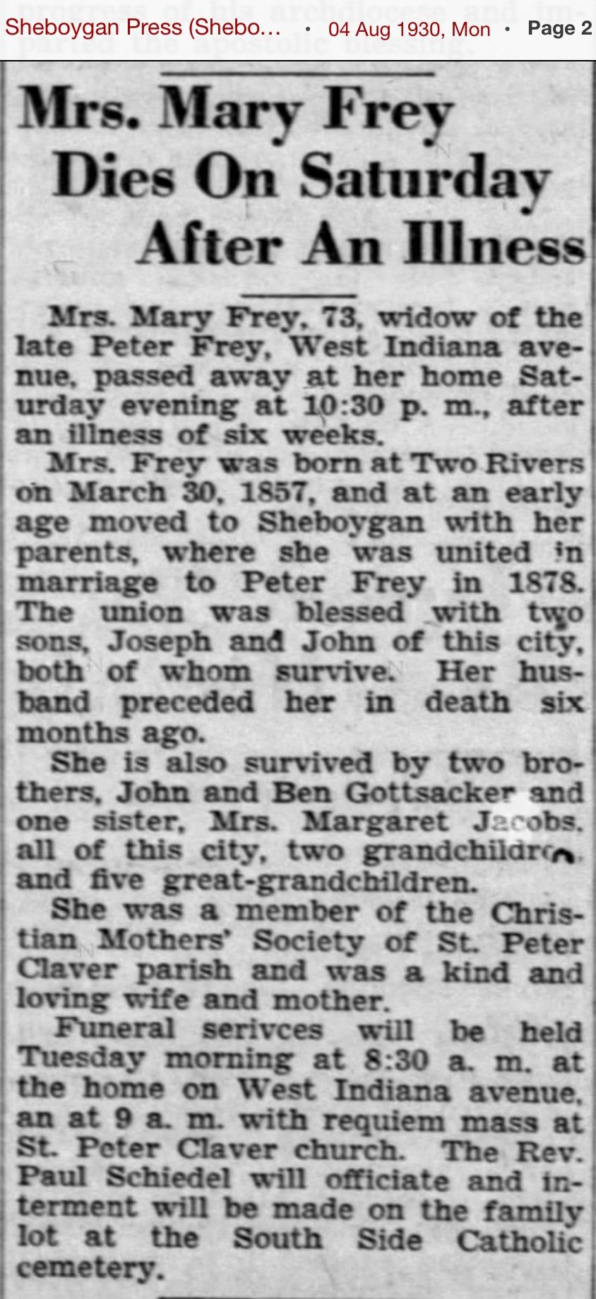 Mary (Mary Ann) Gottsacker Frey obit in the Sheboygan Press dated Aug. 4, 1930.