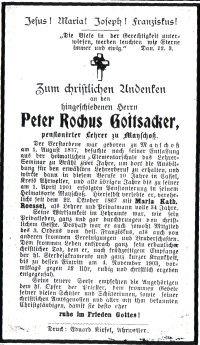 Image of the prayer card for Peter Rochus Gottsacker, former headmaster of the school in Mayschoss. Peter Rochus died in 1903. A photcopy of the prayer card was provided by Franz Gottsacker of Mayschoss.